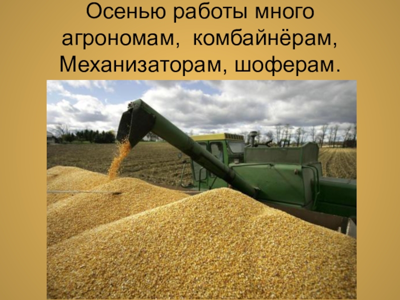 Слайд 18Осенью работы много агрономам, комбайнёрам, Механизаторам, шоферам.