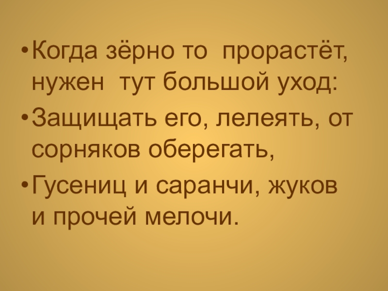 Когда зёрно то прорастёт, нужен тут большой уход:Защищать его, лелеять, от сорняков оберегать,Гусениц и саранчи, жуков и