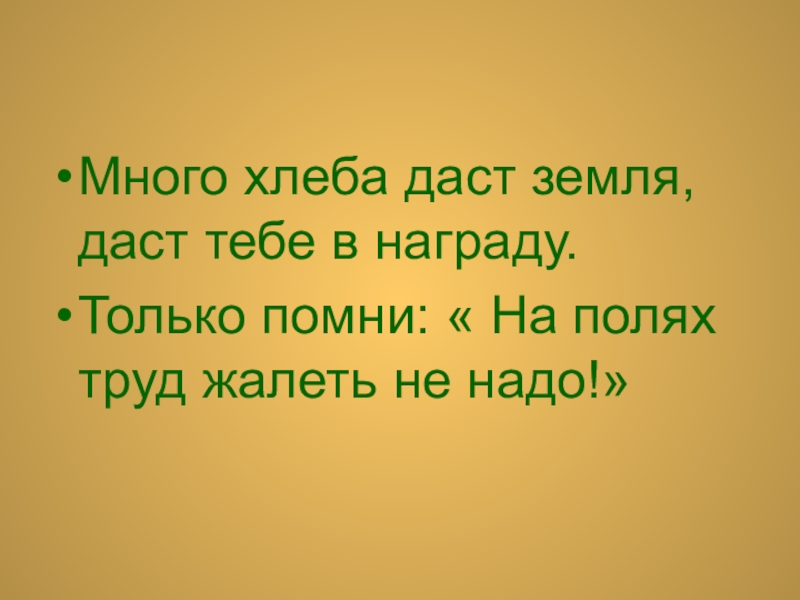 Много хлеба даст земля, даст тебе в награду.Только помни: « На полях труд жалеть не надо!»