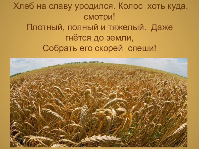 Слайд 16Хлеб на славу уродился. Колос хоть куда, смотри! Плотный, полный и тяжелый.