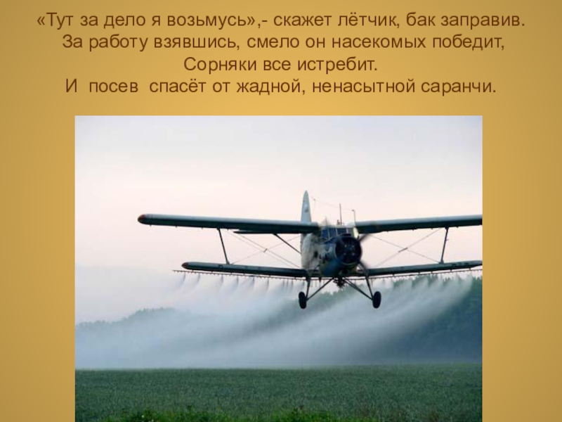 «Тут за дело я возьмусь»,- скажет лётчик, бак заправив.  За работу взявшись, смело он насекомых победит,