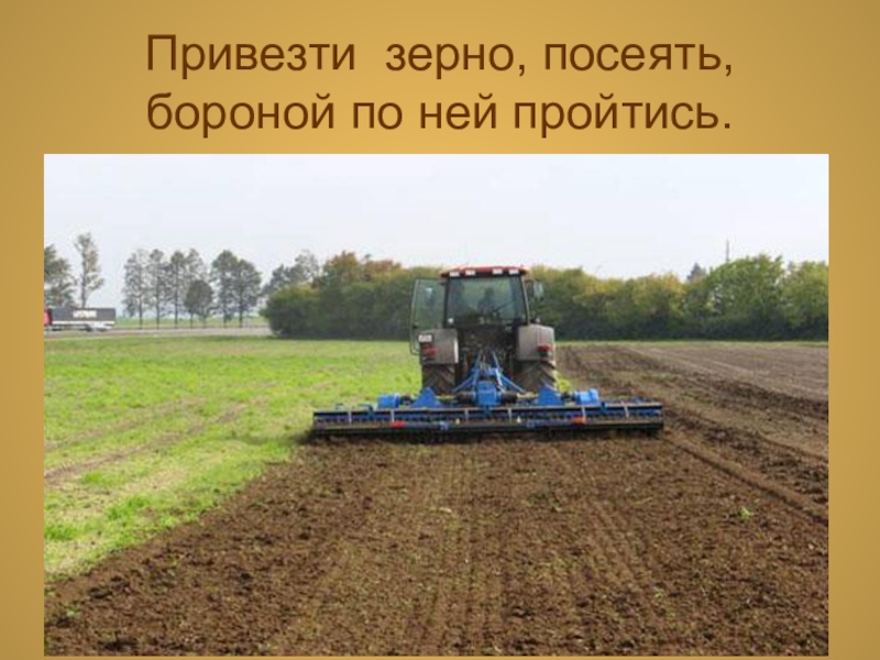 Слайд 7Привезти зерно, посеять, бороной по ней пройтись.