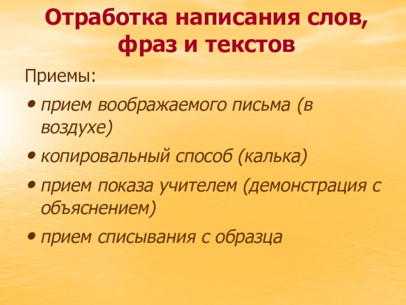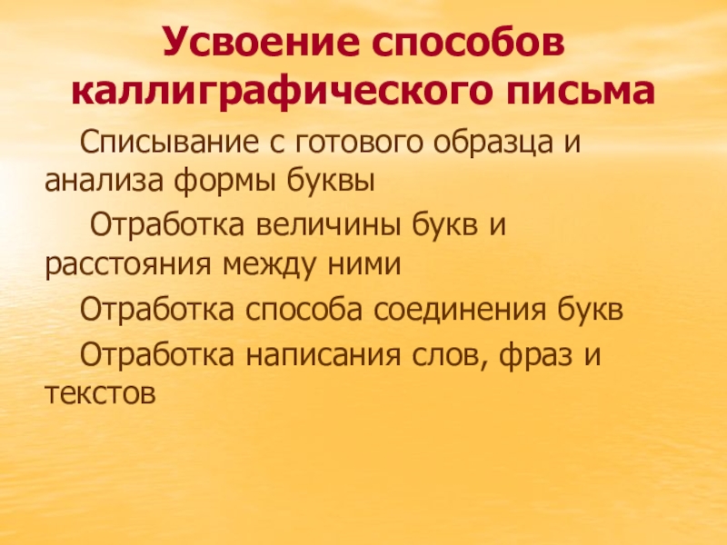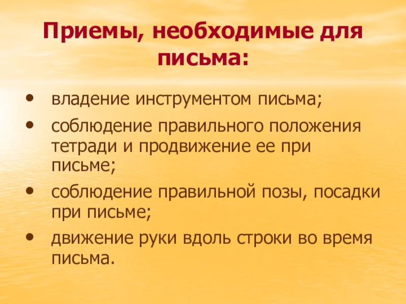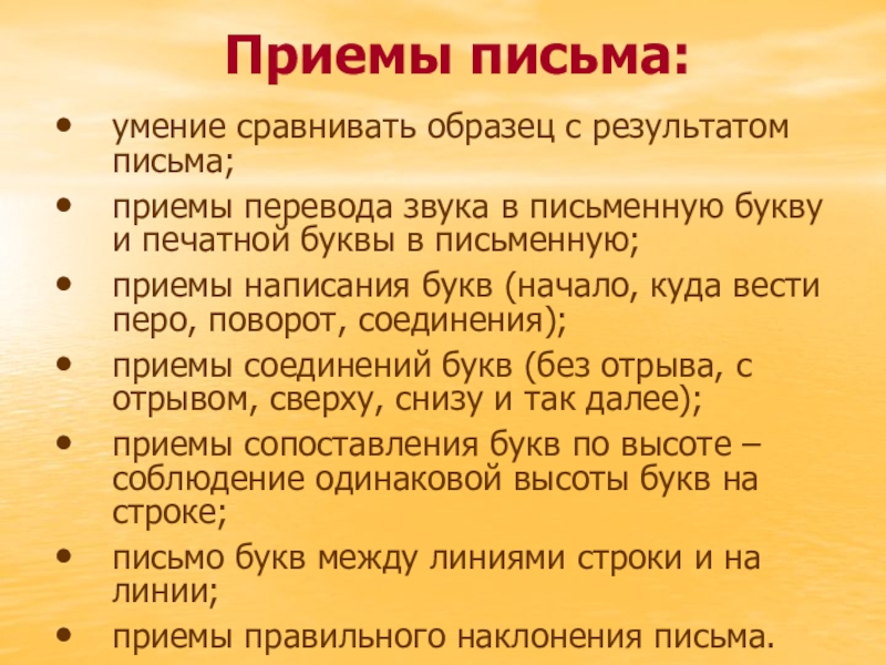 приемы написания букв (начало, куда вести перо, поворот, соединения);