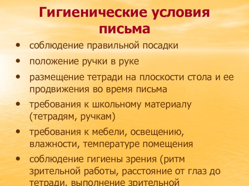 соблюдение гигиены зрения (ритм зрительной работы, расстояние от глаз до тетради, выполнение зрительной гимнастики).