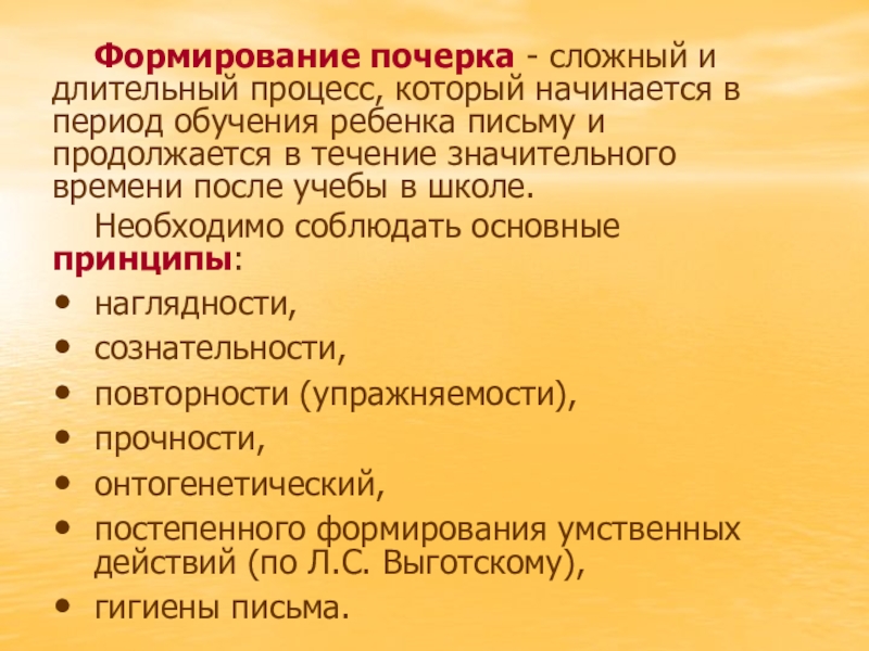 Слайд 5Формирование почерка - сложный и длительный процесс, который начинается в период