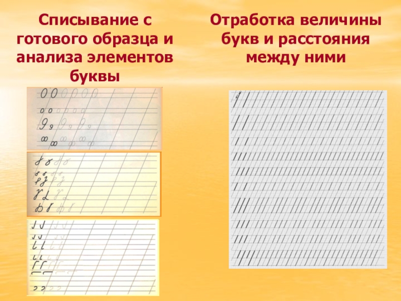 Слайд 14Списывание с готового образца и анализа элементов буквы