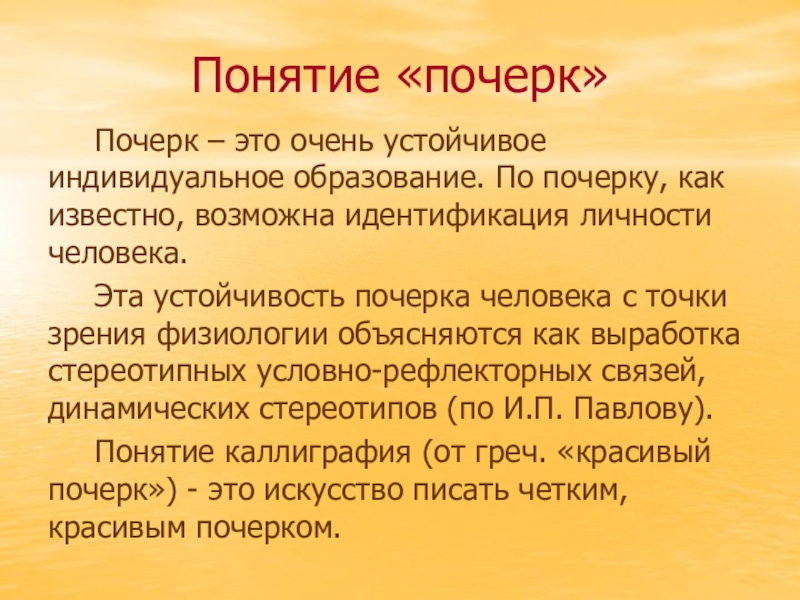 Эта устойчивость почерка человека с точки зрения физиологии объясняются как выработка стереотипных условно-рефлекторных связей, динамических стереотипов (по И.П. Павлову).