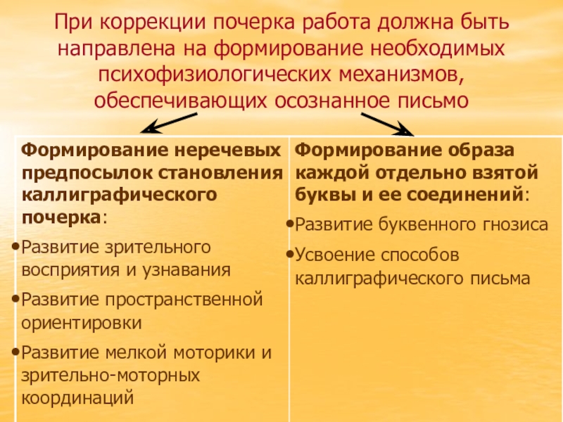 Слайд 8При коррекции почерка работа должна быть направлена на формирование необходимых психофизиологических