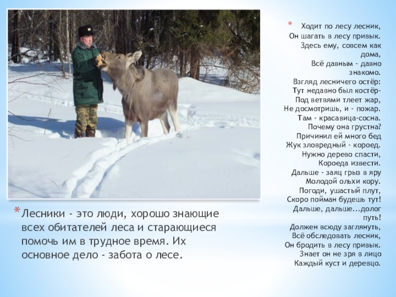 Лесники - это люди, хорошо знающие всех обитателей леса и старающиеся помочь им в трудное время. Их основное дело - забота о лесе.