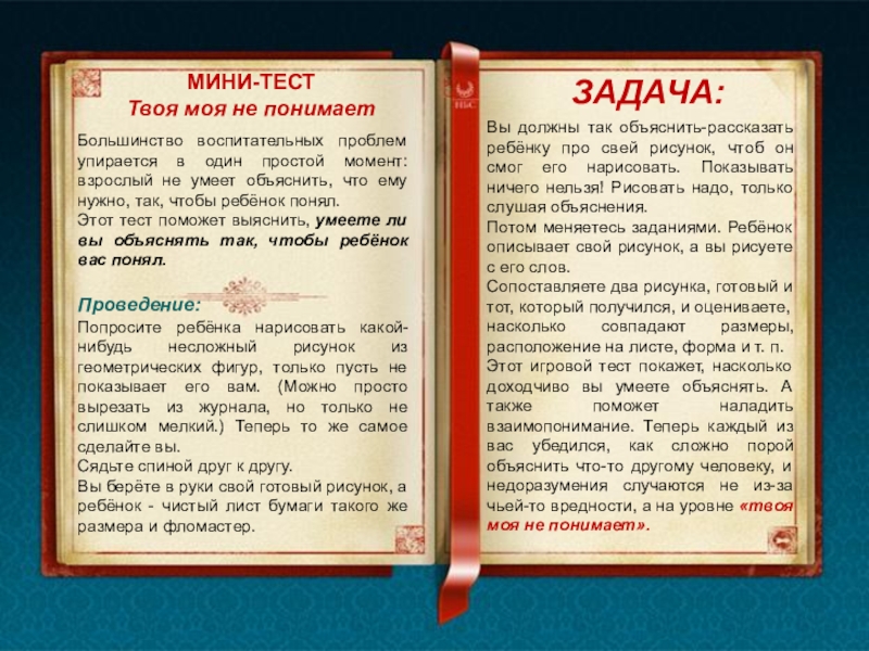 Этот игровой тест покажет, насколько доходчиво вы умеете объяснять. А также поможет наладить взаимопонимание. Теперь каждый из вас убедился, как сложно порой объяснить что-то другому человеку, и недоразумения случаются не из-за чьей-то вредности, а на уровне «твоя моя не понимает».