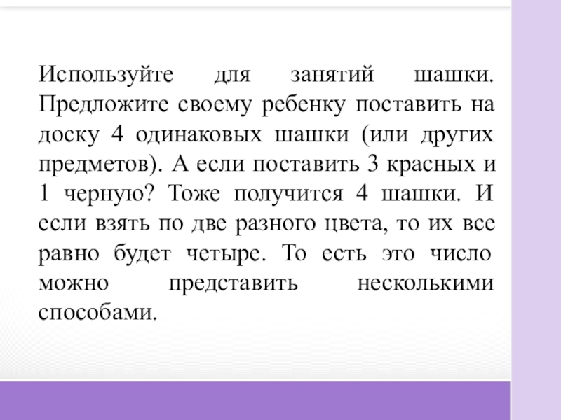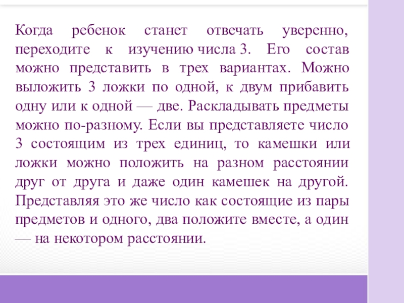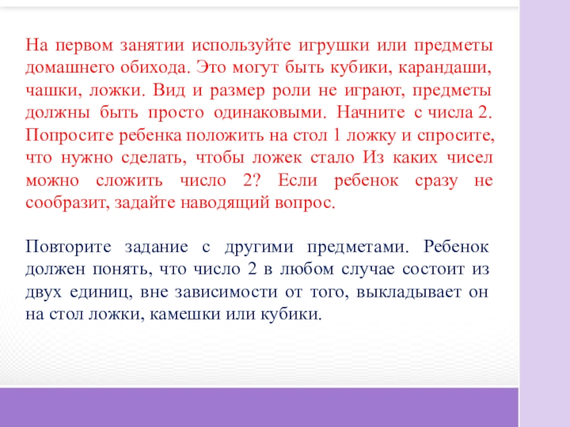 Повторите задание с другими предметами. Ребенок должен понять, что число 2 в любом случае состоит из двух единиц, вне зависимости от того, выкладывает он на стол ложки, камешки или кубики.