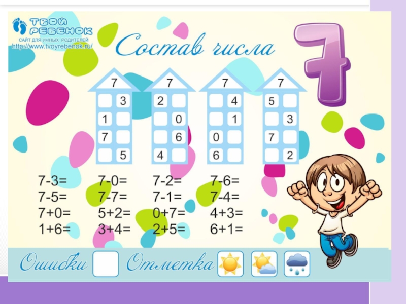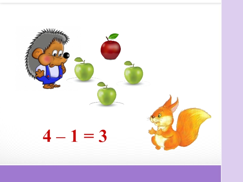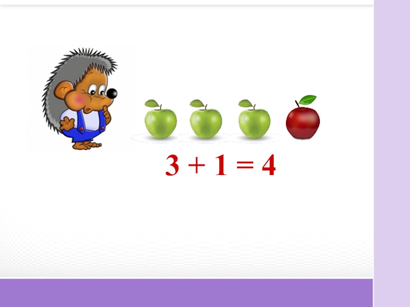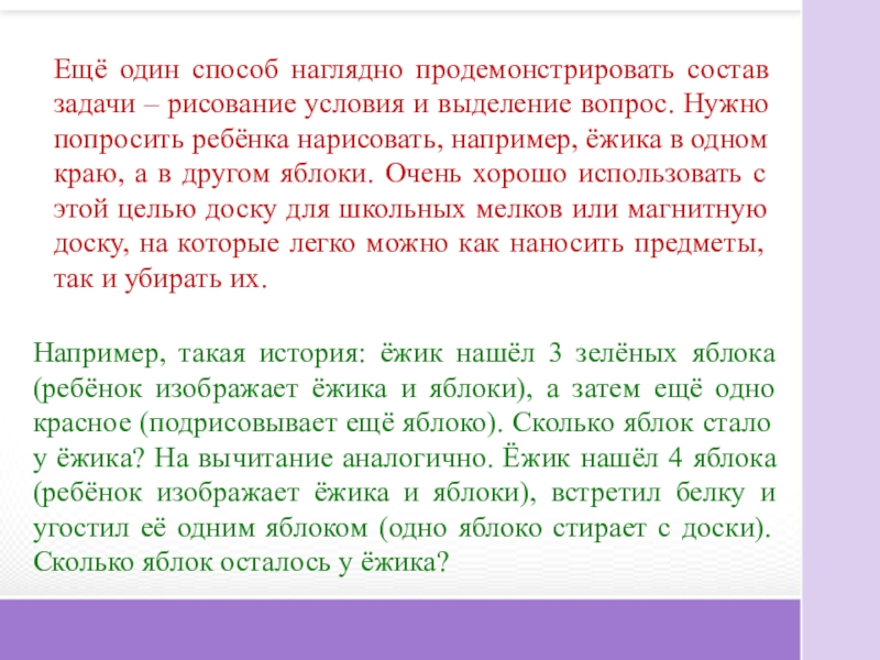 Например, такая история: ёжик нашёл 3 зелёных яблока (ребёнок изображает ёжика и яблоки), а затем ещё одно красное (подрисовывает ещё яблоко). Сколько яблок стало у ёжика? На вычитание аналогично. Ёжик нашёл 4 яблока (ребёнок изображает ёжика и яблоки), встретил белку и угостил её одним яблоком (одно яблоко стирает с доски). Сколько яблок осталось у ёжика?