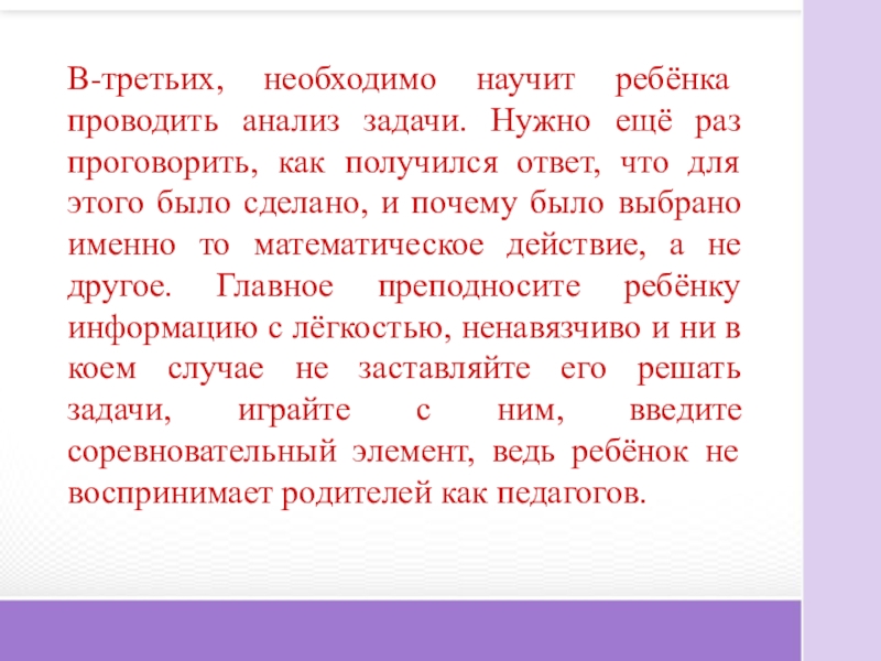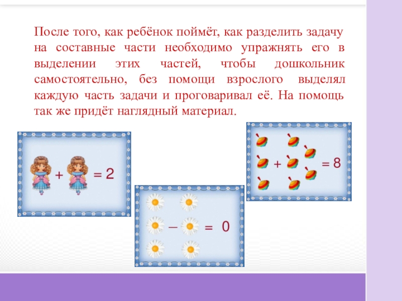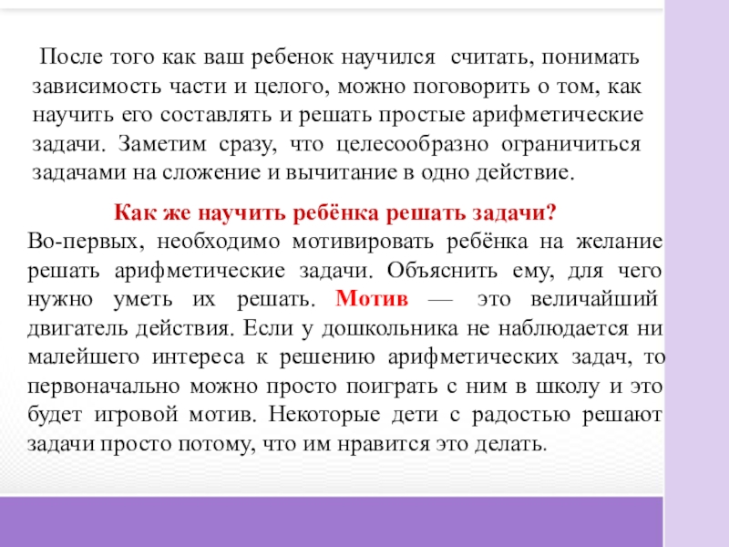 Во-первых, необходимо мотивировать ребёнка на желание решать арифметические задачи. Объяснить ему, для чего нужно уметь их решать. Мотив — это величайший двигатель действия. Если у дошкольника не наблюдается ни малейшего интереса к решению арифметических задач, то первоначально можно просто поиграть с ним в школу и это будет игровой мотив. Некоторые дети с радостью решают задачи просто потому, что им нравится это делать.