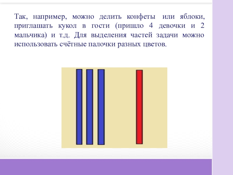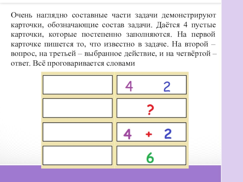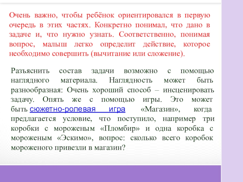 Разъяснить состав задачи возможно с помощью наглядного материала. Наглядность может быть разнообразная: Очень хороший способ – инсценировать задачу. Опять же с помощью игры. Это может быть сюжетно-ролевая игра «Магазин», когда предлагается условие, что поступило, например три коробки с мороженым «Пломбир» и одна коробка с мороженым «Эскимо», вопрос: сколько всего коробок мороженого привезли в магазин?