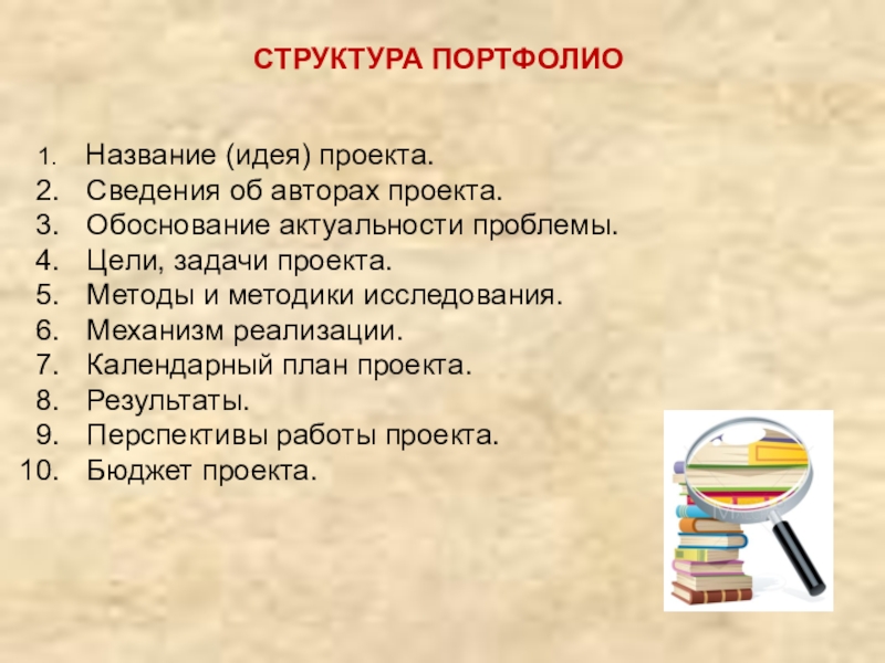 ШЕСТОЕ «П» ПРОЕКТА – его «Портфолио», т.е. папка, в которой собраны все рабочие материалы проекта (черновики, дневные планы, отчеты и др.).