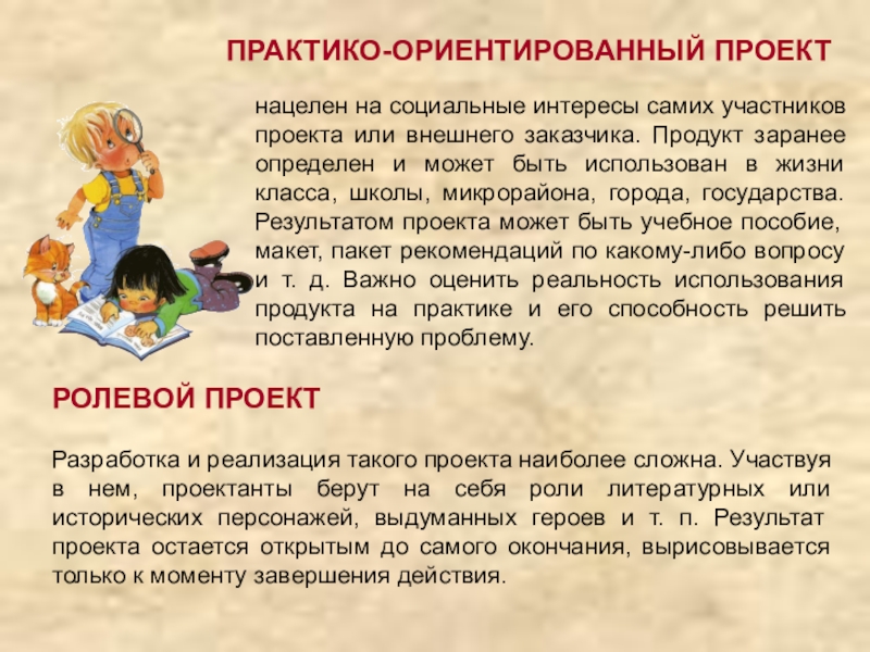 Разработка и реализация такого проекта наиболее сложна. Участвуя в нем, проектанты берут на себя роли литературных или исторических персонажей, выдуманных героев и т. п. Результат проекта остается открытым до самого окончания, вырисовывается только к моменту завершения действия.