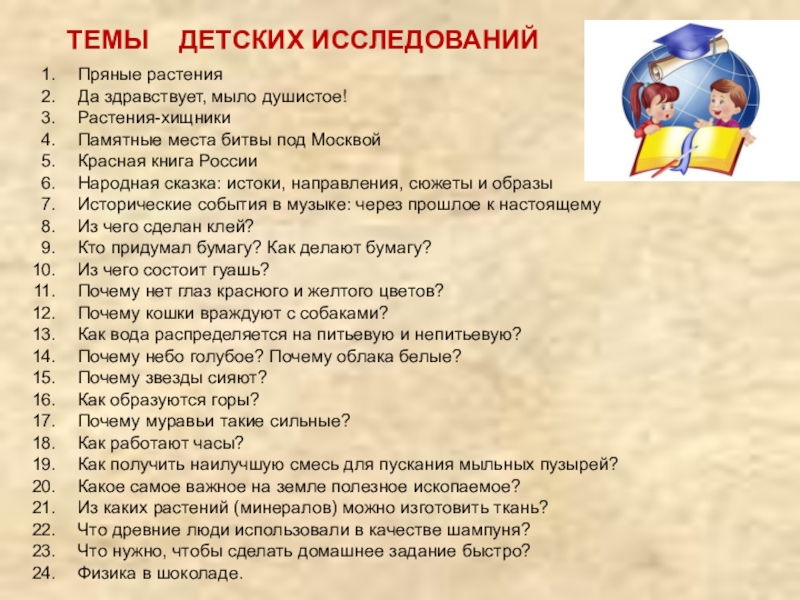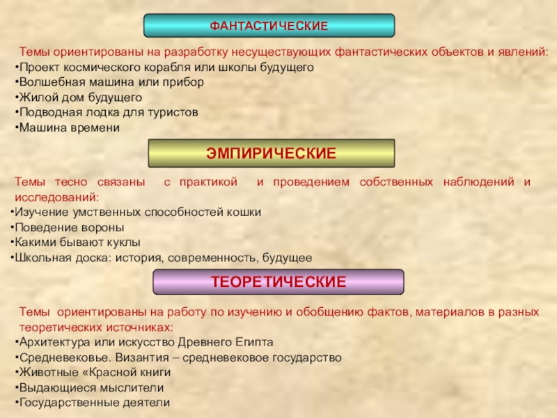 Темы ориентированы на работу по изучению и обобщению фактов, материалов в разных теоретических источниках: