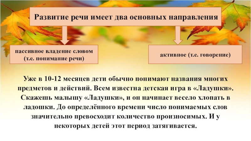 Уже в 10-12 месяцев дети обычно понимают названия многих предметов и действий. Всем известна детская игра в «Ладушки». Скажешь малышу «Ладушки», и он начинает весело хлопать в ладошки. До определённого времени число понимаемых слов значительно превосходит количество произносимых. И у некоторых детей этот период затягивается.