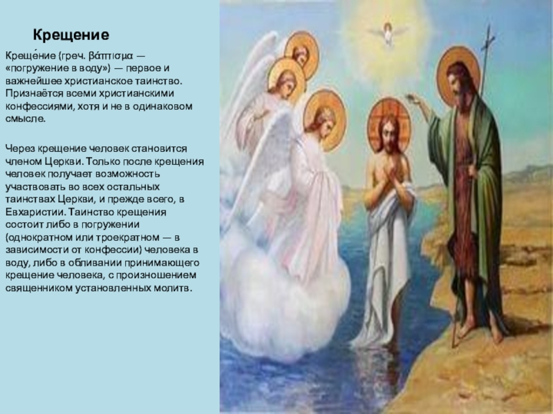 Креще́ние (греч. βάπτισμα — «погружение в воду») — первое и важнейшее