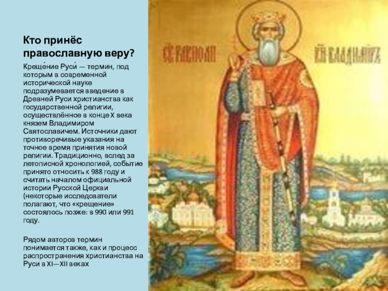исторической науке подразумевается введение в Древней Руси христианства как государственной религии, осуществлённое в конце X века князем Владимиром Святославичем. Источники дают противоречивые указания на точное время принятия новой религии. Традиционно, вслед за летописной хронологией, событие принято относить к 988 году и считать началом официальной истории Русской Церкви (некоторые исследователи полагают, что «крещение» состоялось позже: в 990 или 991 году.