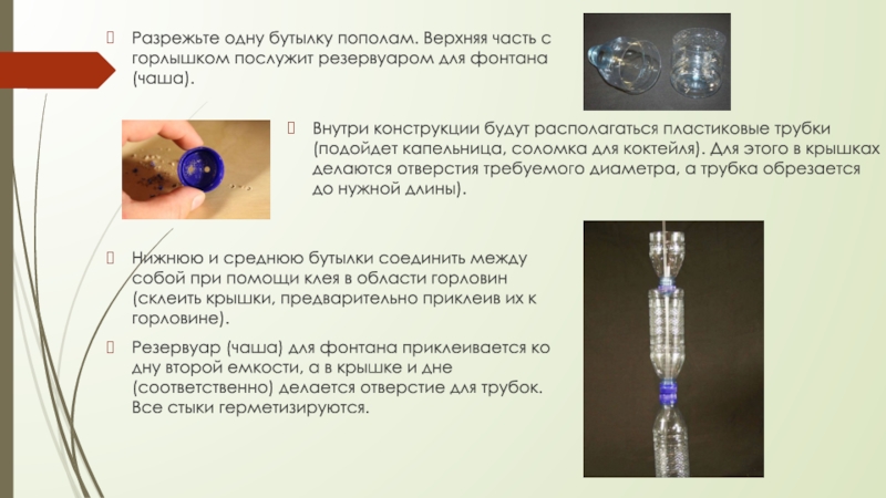 Резервуар (чаша) для фонтана приклеивается ко дну второй емкости, а в крышке и дне (соответственно) делается отверстие для трубок. Все стыки герметизируются.