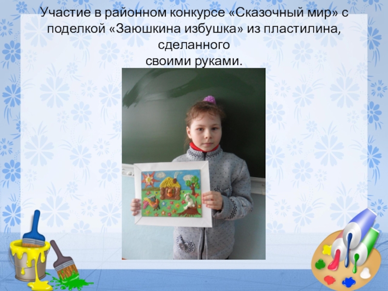Слайд 15Участие в районном конкурсе «Сказочный мир» с поделкой «Заюшкина избушка» из