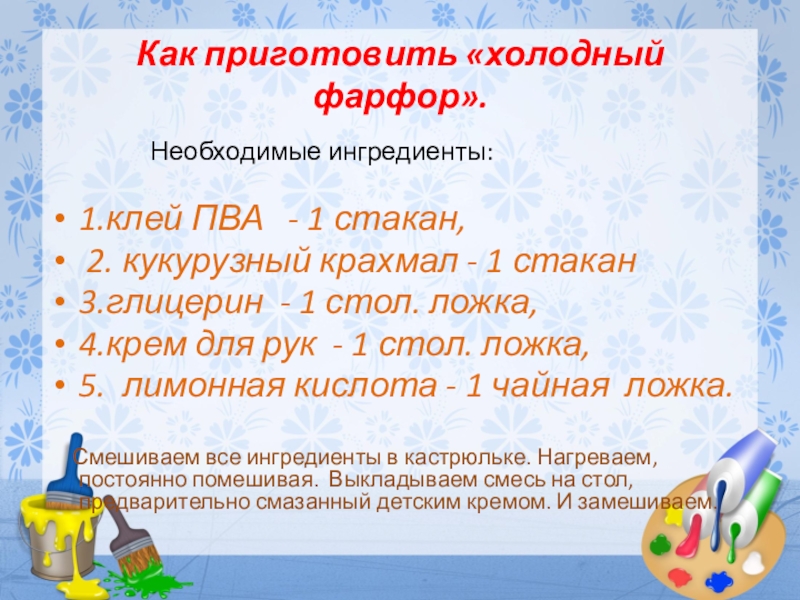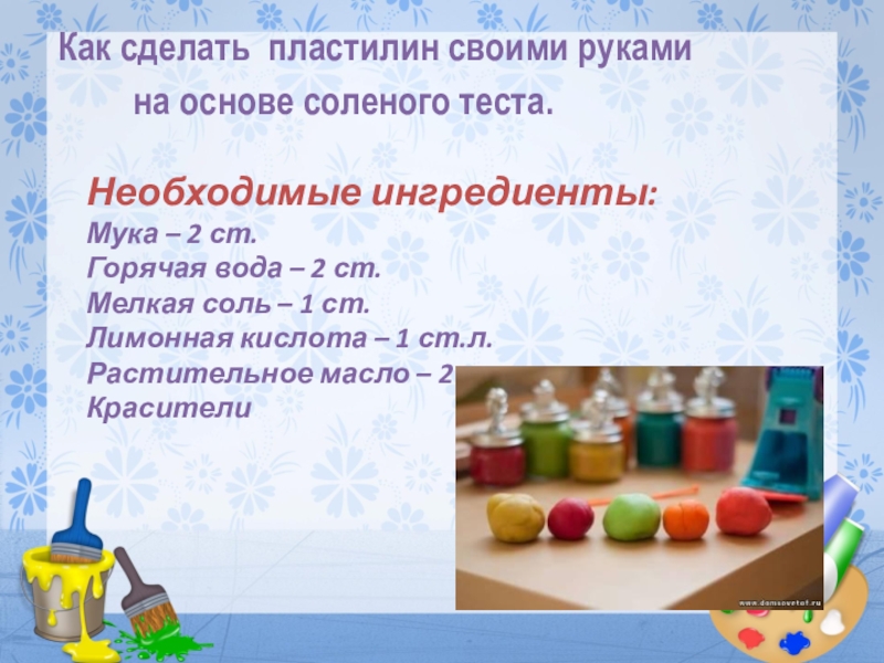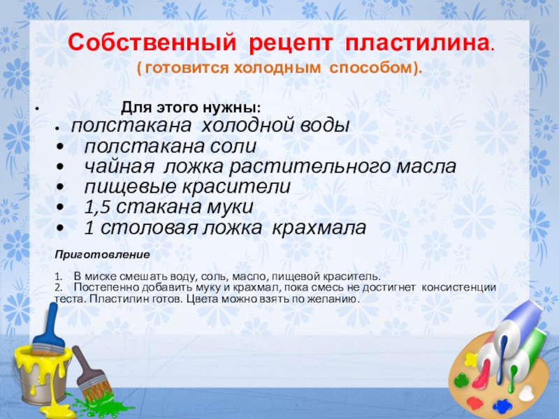 Слайд 16Ознакомление родителей дошкольников с техникой приготовления пластилина.