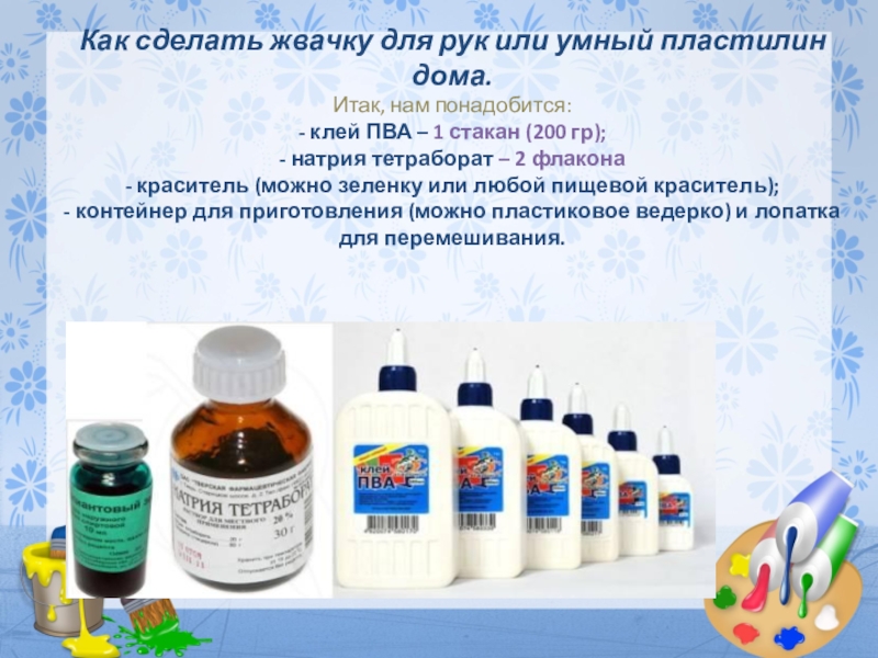 Слайд 13Как сделать жвачку для рук или умный пластилин дома.