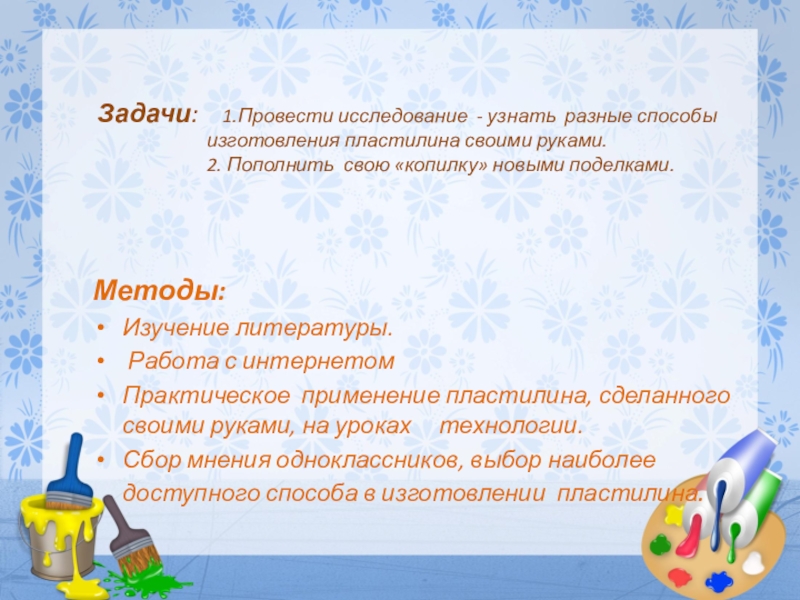 Слайд 3Задачи: 1.Провести исследование - узнать разные способы изготовления пластилина своими