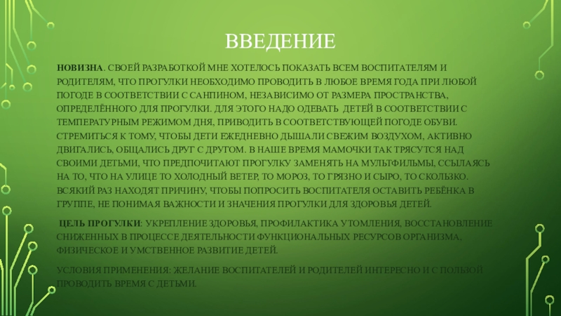 прогулки необходимо проводить в любое время года при любой погоде в соответствии с САНПИНОМ, независимо от размера пространства, определённого для прогулки. Для этого надо одевать детей в соответствии с температурным режимом дня, приводить в соответствующей погоде обуви. Стремиться к тому, чтобы дети ежедневно дышали свежим воздухом, активно двигались, общались друг с другом. В наше время мамочки так трясутся над своими детьми, что предпочитают прогулку заменять на мультфильмы, ссылаясь на то, что на улице то холодный ветер, то мороз, то грязно и сыро, то скользко. Всякий раз находят причину, чтобы попросить воспитателя оставить ребёнка в группе, не понимая важности и значения прогулки для здоровья детей.