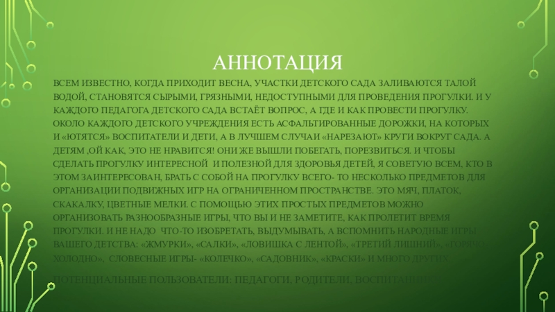Потенциальные пользователи: педагоги, родители, воспитанники.
