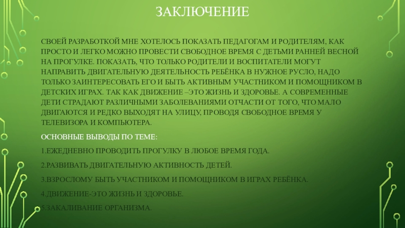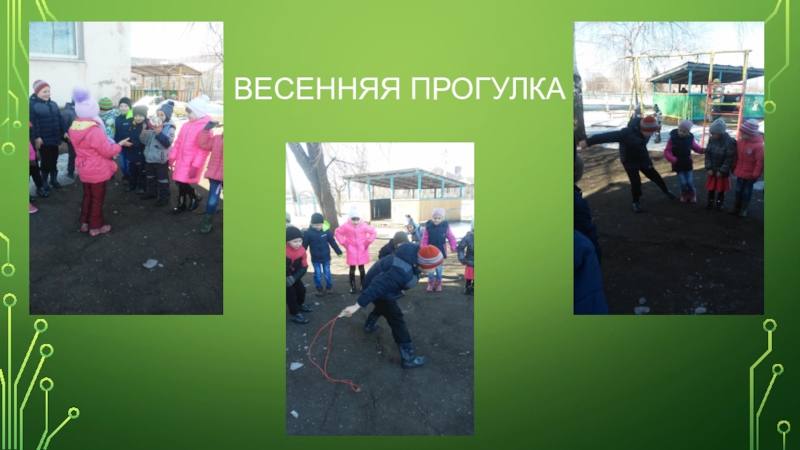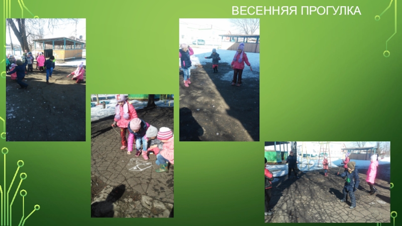 легко можно провести свободное время с детьми ранней весной на прогулке. Показать, что только родители и воспитатели могут направить двигательную деятельность ребёнка в нужное русло, надо только заинтересовать его и быть активным участником и помощником в детских играх. Так как движение –это жизнь и здоровье. А современные дети страдают различными заболеваниями отчасти от того, что мало двигаются и редко выходят на улицу, проводя свободное время у телевизора и компьютера.