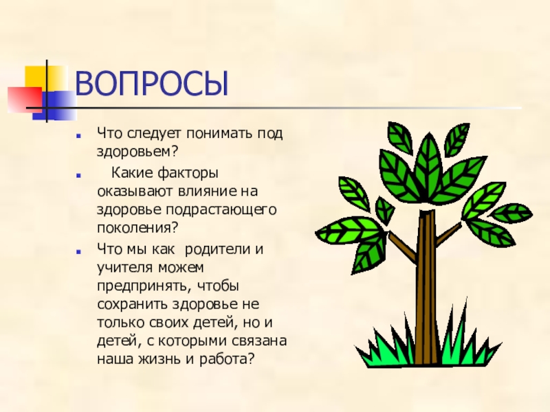 ВОПРОСЫЧто следует понимать под здоровьем? Какие факторы оказывают влияние на здоровье подрастающего поколения? Что мы как родители и учителя можем предпринять, чтобы сохранить здоровье не только своих детей, но и детей, с которыми связана наша