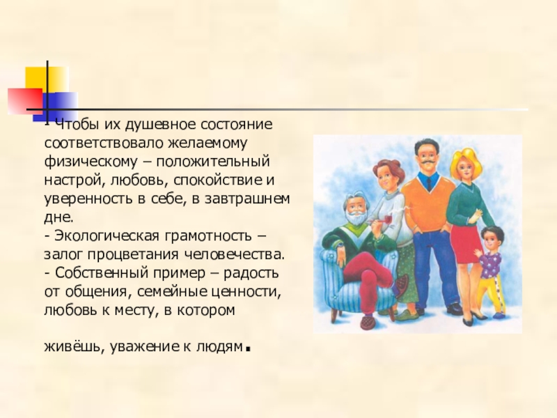 любовь, спокойствие и уверенность в себе, в завтрашнем дне. - Экологическая грамотность – залог процветания человечества. - Собственный пример – радость от общения, семейные ценности, любовь к месту, в котором живёшь, уважение к людям.