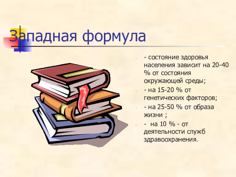 Западная формула - состояние здоровья населения зависит на 20-40 % от состояния окружающей среды; - на