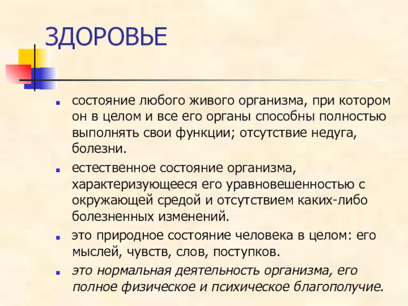 естественное состояние организма, характеризующееся его уравновешенностью с окружающей средой и отсутствием каких-либо болезненных изменений.