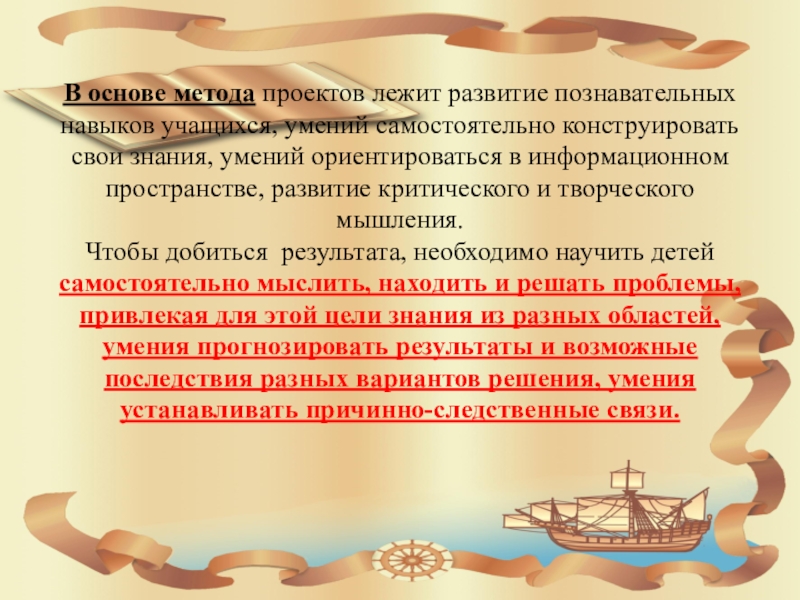 Слайд 8В основе метода проектов лежит развитие познавательных навыков учащихся, умений самостоятельно