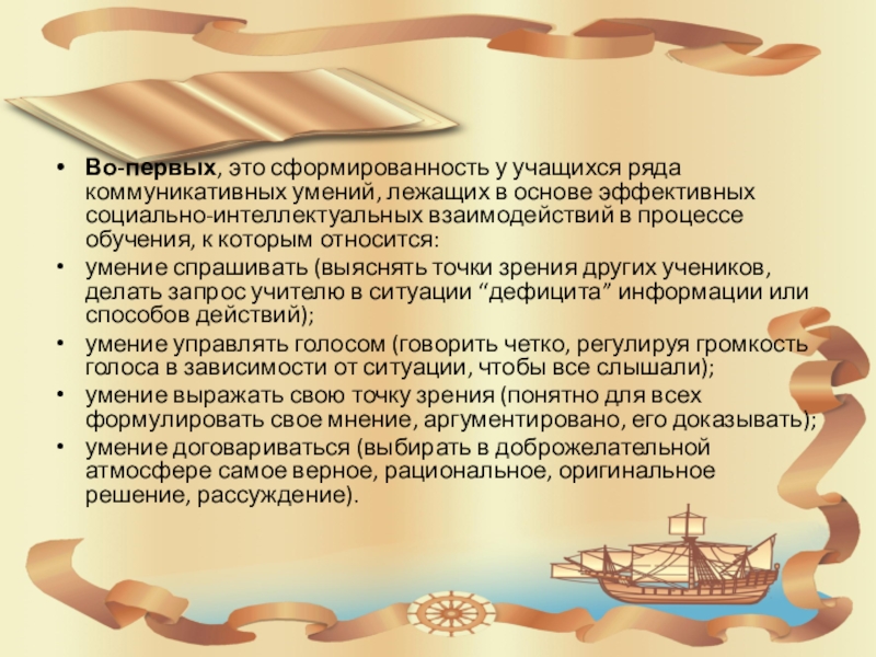 Слайд 22Во-первых, это сформированность у учащихся ряда коммуникативных умений, лежащих в основе
