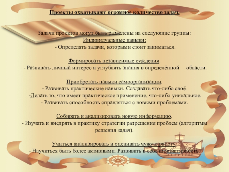 самостоятельно, в группе или самому, максимально используя свои возможности; это деятельность, позволяющая проявить себя, попробовать свои силы, приложить свои знания, принести пользу и показать публично достигнутый результат; это деятельность, направленная на решение интересной проблемы, сформулированной самими учащимися в виде цели и задачи, когда результат этой деятельности – найденный способ решения проблемы – носит практический характер, имеет важное прикладное значение и, что весьма важно, интересен и значим для самих открывателей.