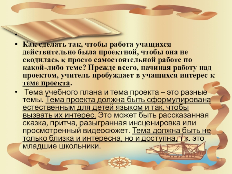 не сводилась к просто самостоятельной работе по какой-либо теме? Прежде всего, начиная работу над проектом, учитель пробуждает в учащихся интерес к теме проекта.