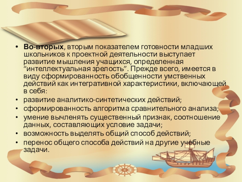Слайд 23Во-вторых, вторым показателем готовности младших школьников к проектной деятельности выступает развитие