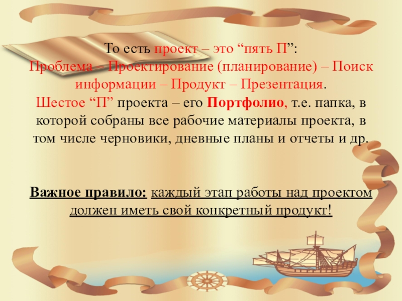 Шестое “П” проекта – его Портфолио, т.е. папка, в которой собраны все рабочие материалы проекта, в том числе черновики, дневные планы и отчеты и др.