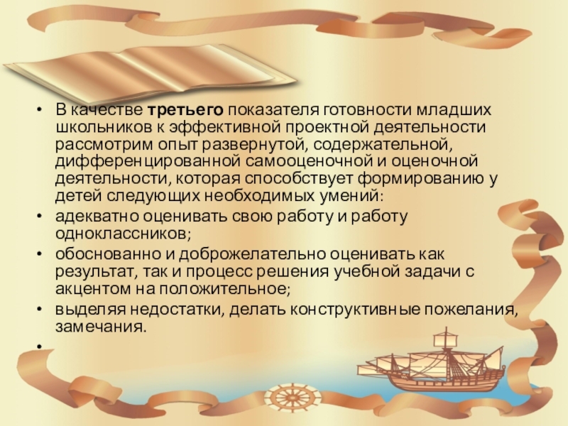 Слайд 24В качестве третьего показателя готовности младших школьников к эффективной проектной деятельности
