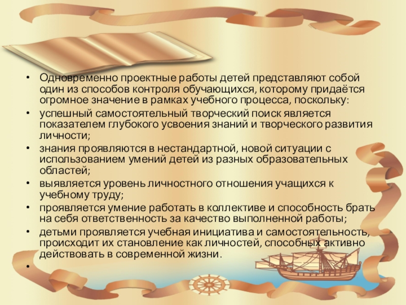 Слайд 36Одновременно проектные работы детей представляют собой один из способов контроля обучающихся,