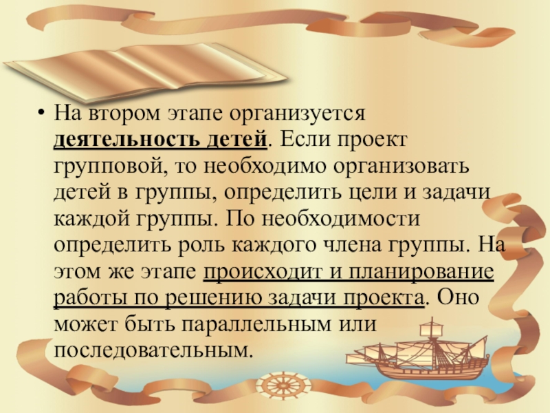 Слайд 30На втором этапе организуется деятельность детей. Если проект групповой, то необходимо
