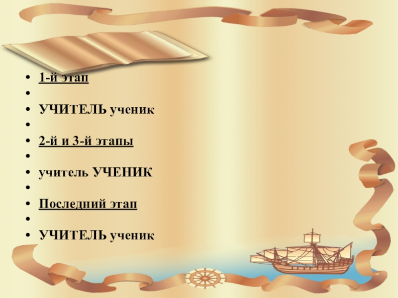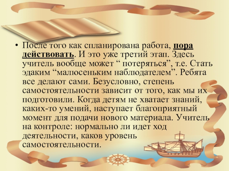 этап. Здесь учитель вообще может “ потеряться”, т.е. Стать эдаким “малюсеньким наблюдателем”. Ребята все делают сами. Безусловно, степень самостоятельности зависит от того, как мы их подготовили. Когда детям не хватает знаний, каких-то умений, наступает благоприятный момент для подачи нового материала. Учитель на контроле: нормально ли идет ход деятельности, каков уровень самостоятельности.