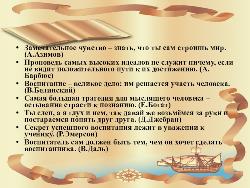 Воспитатель сам должен быть тем, чем он хочет сделать воспитанника. (В.Даль)