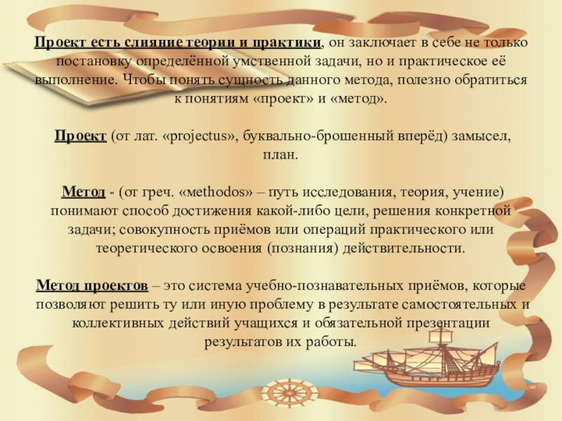 только постановку определённой умственной задачи, но и практическое её выполнение. Чтобы понять сущность данного метода, полезно обратиться к понятиям «проект» и «метод».