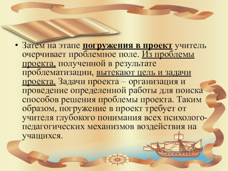 проблемы проекта, полученной в результате проблематизации, вытекают цель и задачи проекта. Задачи проекта – организация и проведение определенной работы для поиска способов решения проблемы проекта. Таким образом, погружение в проект требует от учителя глубокого понимания всех психолого-педагогических механизмов воздействия на учащихся.