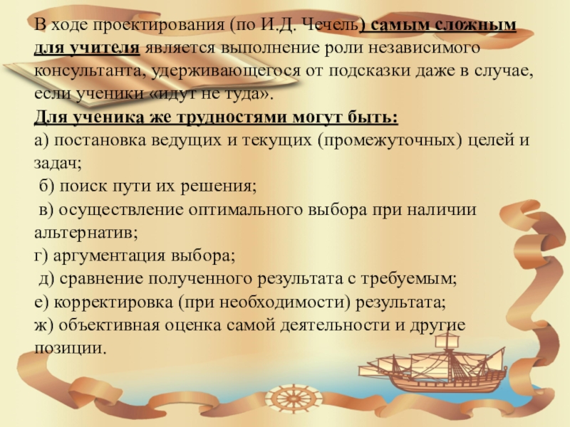Слайд 15В ходе проектирования (по И.Д. Чечель) самым сложным для учителя является